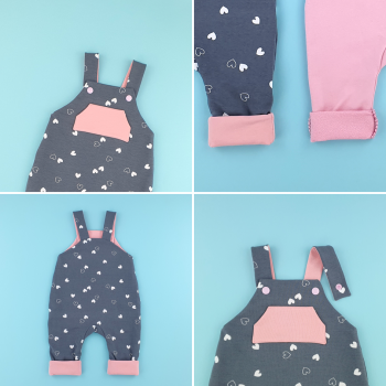 Papierschnittmuster: Schnittmusterbogen & Booklet mit bebilderter Schritt-für-Schritt für eine Baby-Latzhose Größe 50-92.