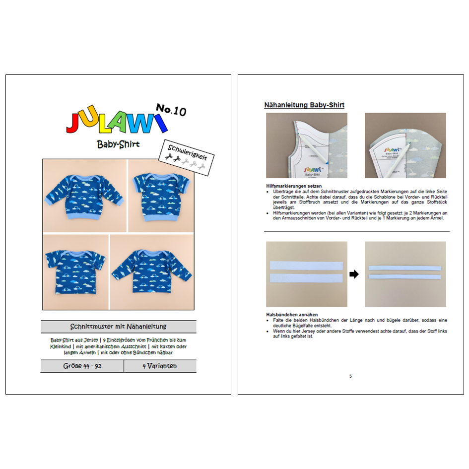 Papierschnittmuster: Schnittmusterbogen & Booklet mit bebilderter Schritt-für-Schritt Anleitung für ein Baby-Shirt Gr 44 - 92.